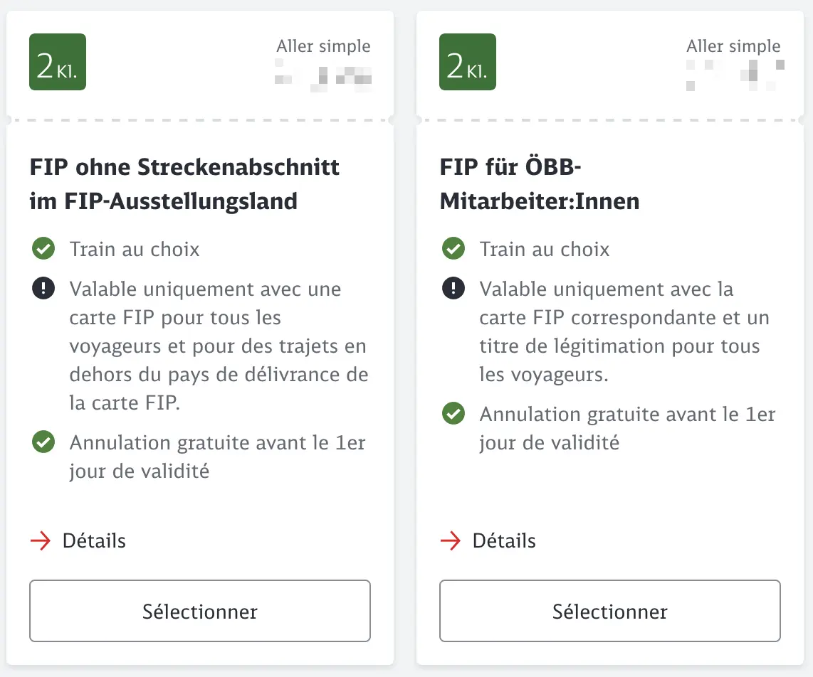Les Billets FIP ne peuvent pas être achetés à bord du train. Un supplément est appliqué aux voyageurs sans billet. La seule exception concerne le supplément pour les trains grandes lignes transfrontaliers vers l’Italie.